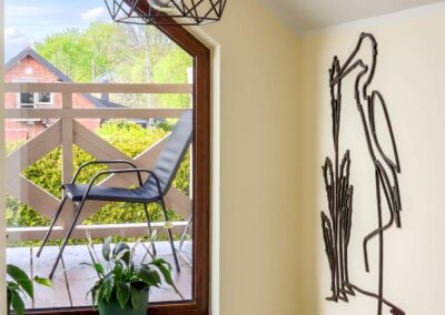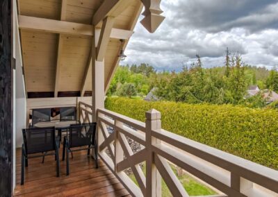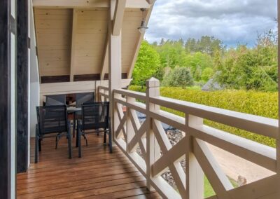 Apartament posiada balkon z widokiem na Puszczę Piską.