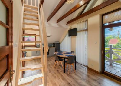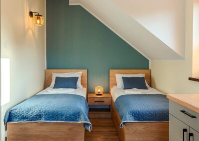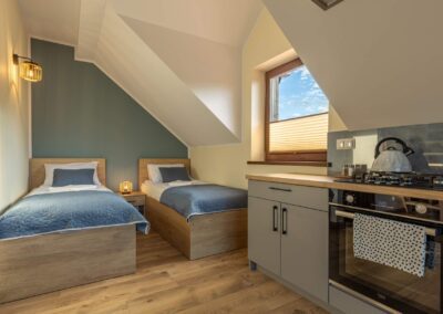 - 3 łóżka – jedno małżeńskie (na antresoli) i dwa 1-osobowe